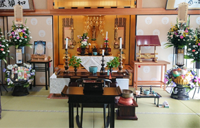 お寺での葬儀は、葬儀会館とは違う本堂ならではの雰囲気があります。本堂の荘厳を大事にして祭壇を組む必要がありません。ご本尊阿弥陀如来様の前で葬儀がおこなえることは誠に意義深いことです。